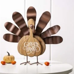 Its a standing turkey for thanks giving. The turkey has metal tail, metal claws and wooden body. The turkey stands on sturdy metal legs.It is write Give Thanks in white on the body.This charming pieces look great anywhere, whether set along your dining room table or on the living room mantel.Constructed of metal and woodWell balanced turkey will stand on table and shelfThe timeless figurine you will love year after yearA quick and easy way to get your home ready for the holidays