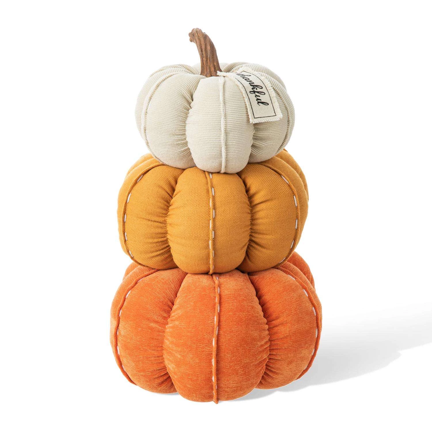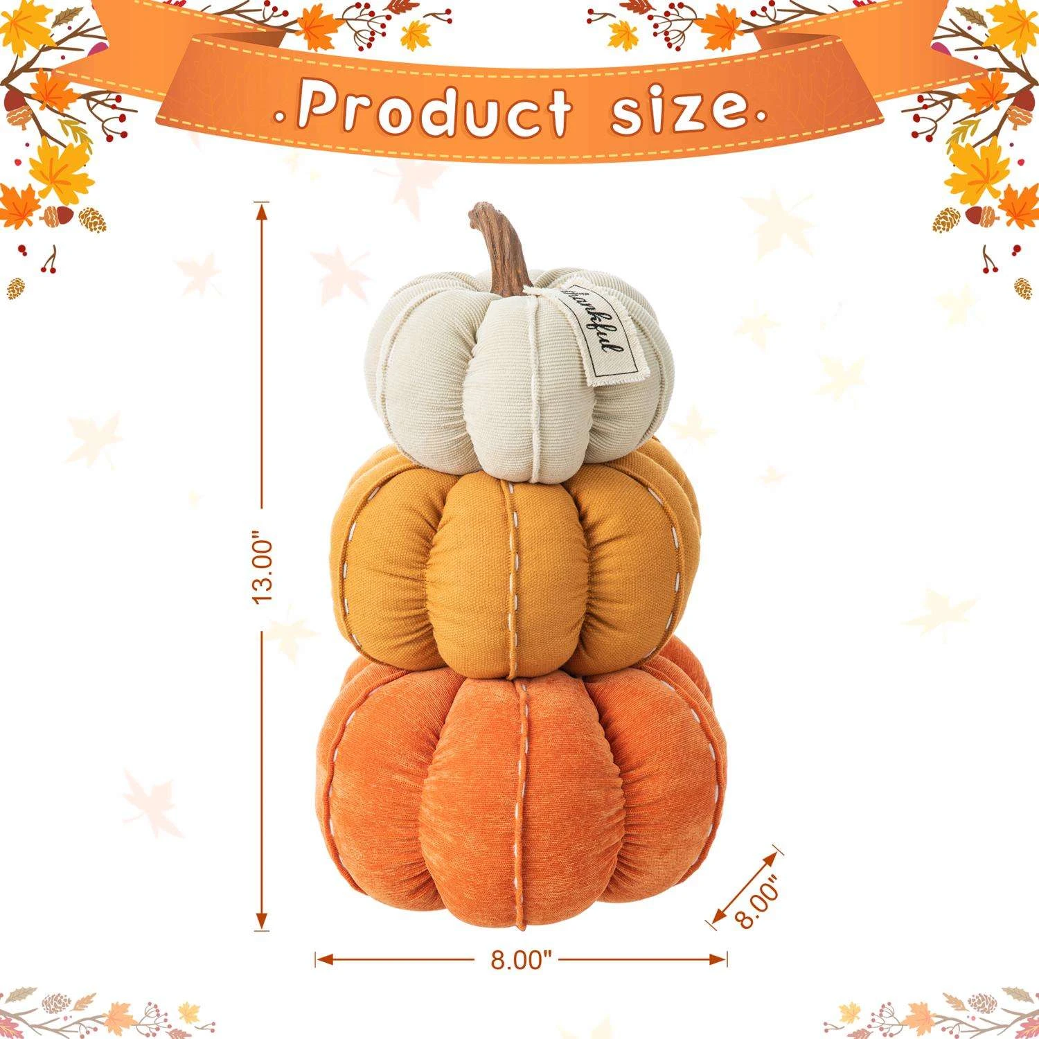 Three fabric pumpkins stacked on top of each other, perfect to place on side tables, fireplace hearths, by the front door, or used as the focal point of the centerpiece for your harvest dining table. Orange, yellow and ivory white fabric gives a homey, harvest-inspired feel.100 percent handcraftTo keep the fabric fresh, clean with a damp clothDark sculpted fabric stem is added for contrast and easy grip