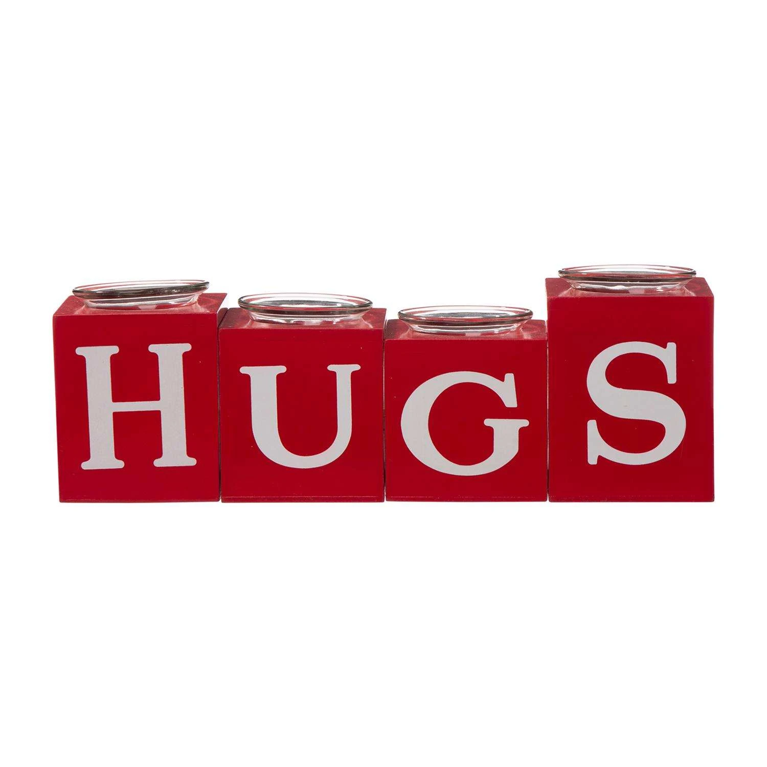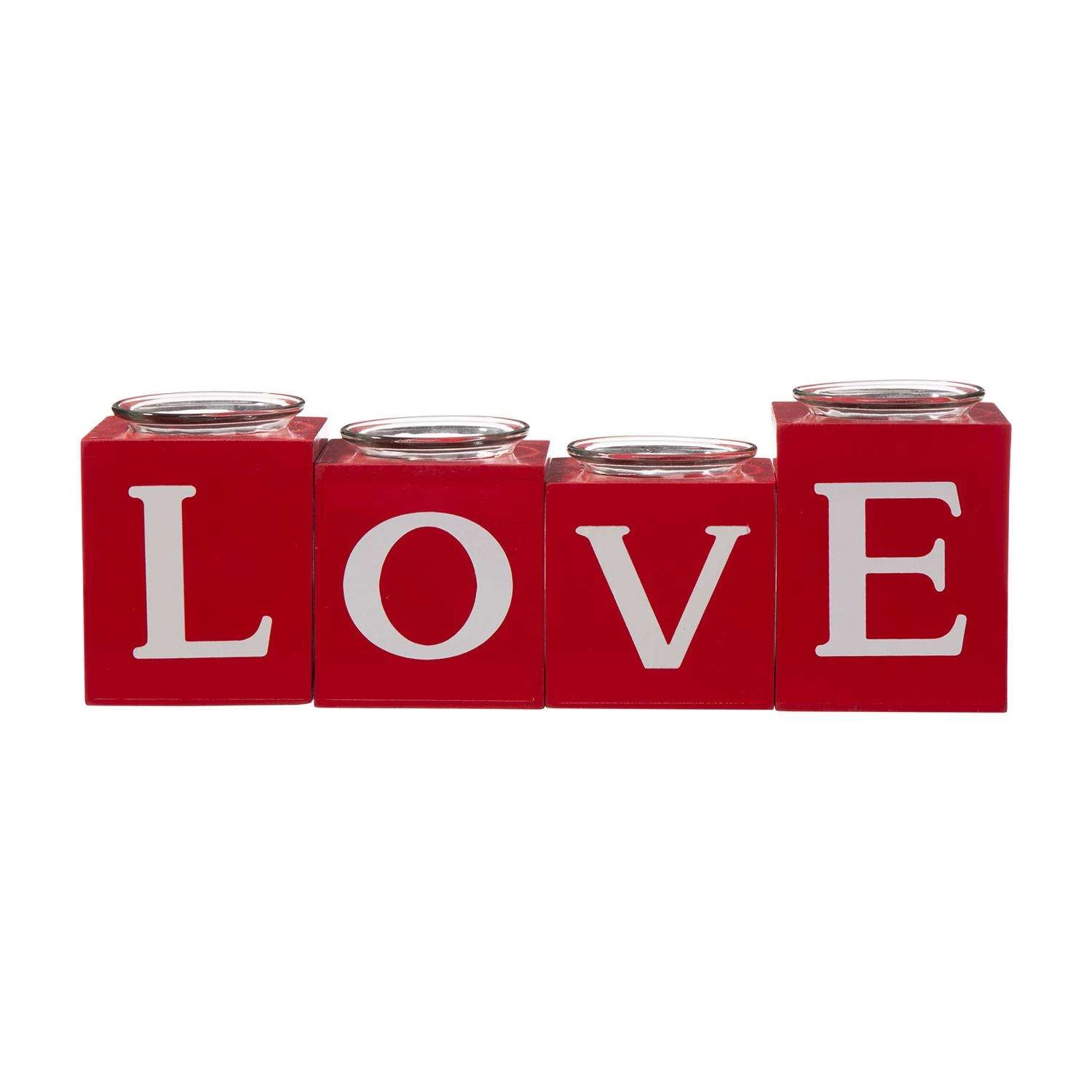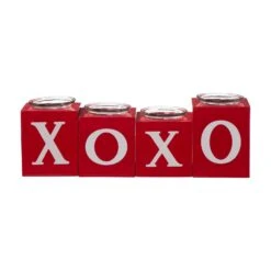 These set of 4 4-inch high red wood candle holders make the perfect accent pieces for any dining room table or living room.Features with different letters on each side which together reads Love, Xoxo, Huge, KissPerfect to use with an everlasting glow LED candle or a real candle of your choiceSet of 4 round wooden pillar candle holders, each measures 4-high tallPerfect as a house-warming present or to decorate your own home in your own unique styleSpot or wipe cleanIntended for indoor or covered patio use only