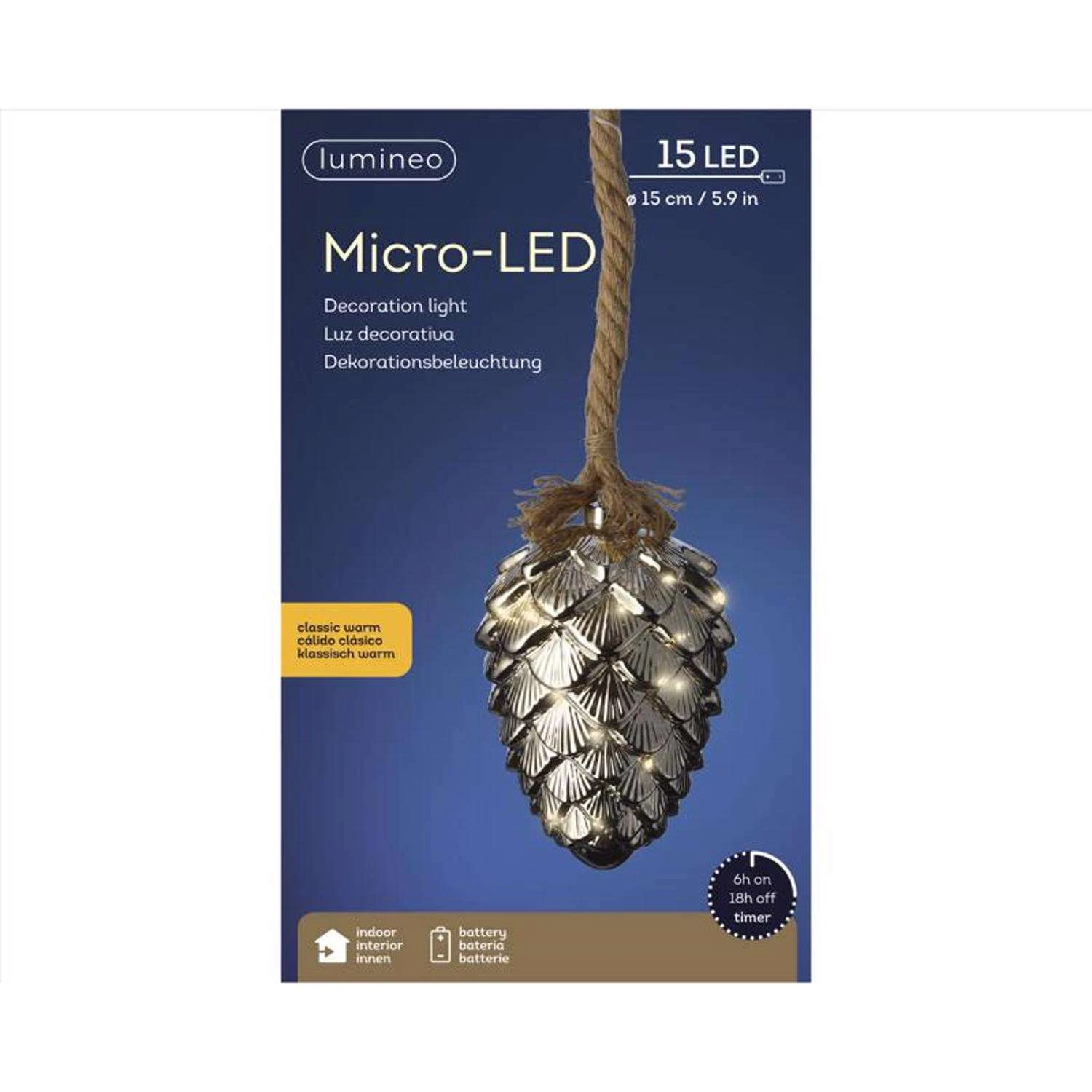 This beautiful micro LED pinecone is a trendy addition to any Christmas setting. Because this item is battery-operated, no plug is needed close by, so it can be hung anywhere. To use the timer press the timer once. The lights will light up automatically every day at the same time and will stay on for 6 hours.Warm White LED micro lights in a smokey pinecone on the end of a ropeTimer 6 hours on, 18 hours offHolds 3 AA batteries, not includedTimer 6 hours on, 18 hours off15cm 15 LED glass pineconeLength of rope to pinecone 80cmConstant